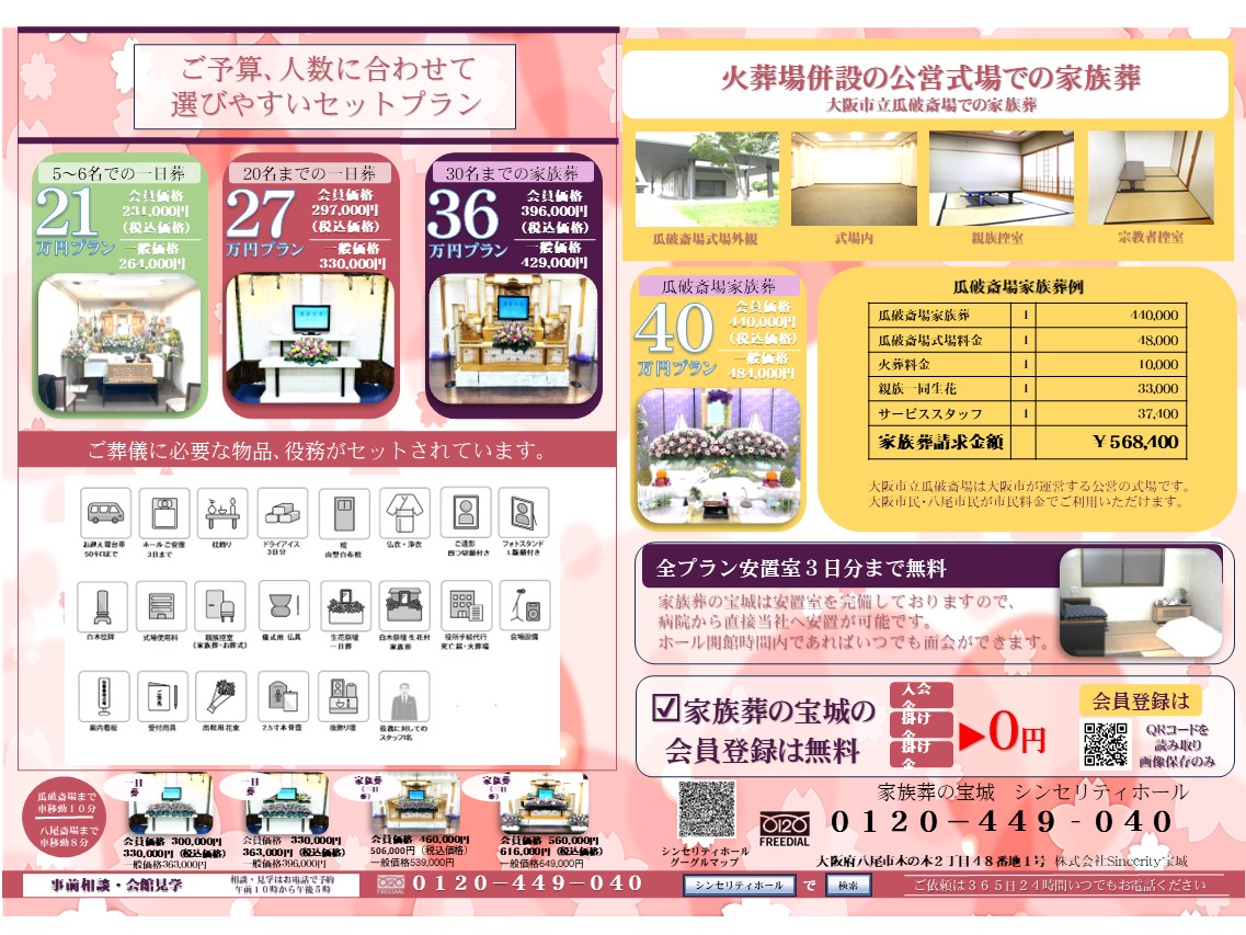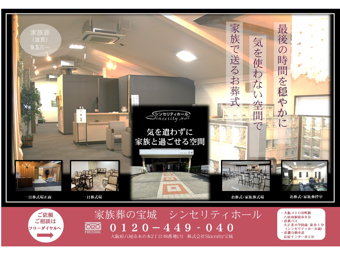 家族葬,葬儀,友人葬,宝城,(ほうじょう)では,瓜破斎場,堺市立斎場,公営斎場公営でのお葬式も承ります。